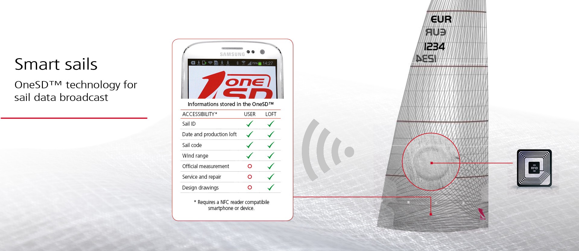 OneSD™ マイクロチップと呼ばれるこの ICチップには、お客様または OneSailsネットワークがセールを使用したりメンテナンスしたりする際に役立つ情報が記録されており、スマートフォンを使ってデータを閲覧出来ます。